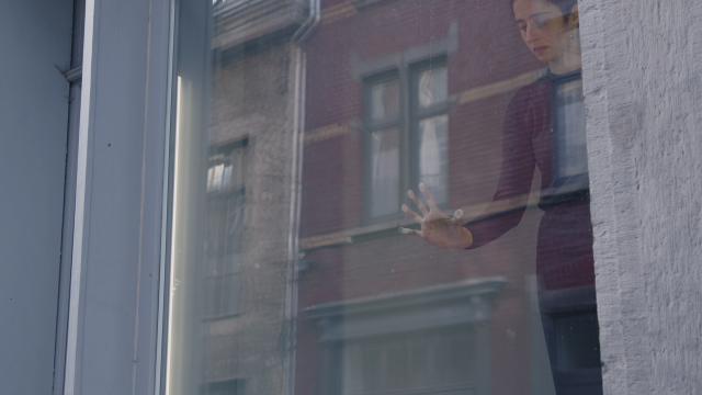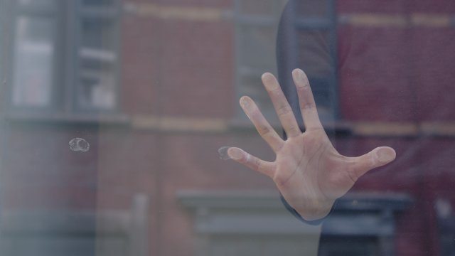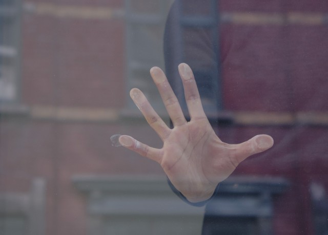 Ici, l’artiste applique son protocole de travail à l’espace intérieur de la vitrine. Avec sa main dont le pouce et l’auriculaire sont imprégnés de pigment, elle suit une ligne, la trace et la révèle. C’est un geste qui fait apparaître la largeur de la pièce. Le corps de l’artiste devient unité de mesure, l’envergure de sa main jalonne son propre parcours. Telle une écriture, une succession d’empreintes transparaît au travers des fenêtres.