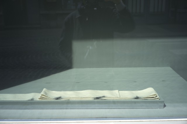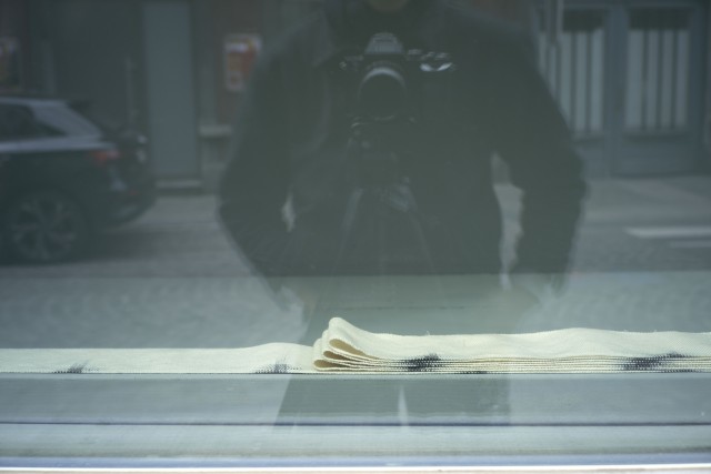Une seconde ligne – réplique de la précédente – a été tissée. Les fils de chaîne* ont été au préalable tendus directement dans l’espace, de manière à s’ajuster à sa largeur le plus précisément possible. Pliée sur elle-même et disposée dans la vitrine, la bande tissée matérialise la mesure réelle, souple et transposable du lieu investit. Elle en devient l’archive. En parallèle, le chemin arpenté avec les doigts est restitué dans cette bande.
