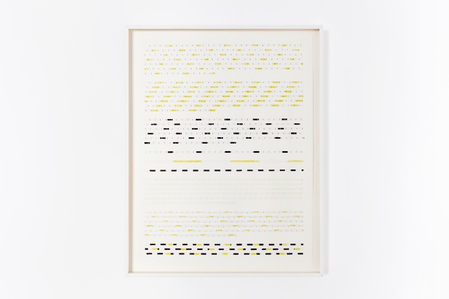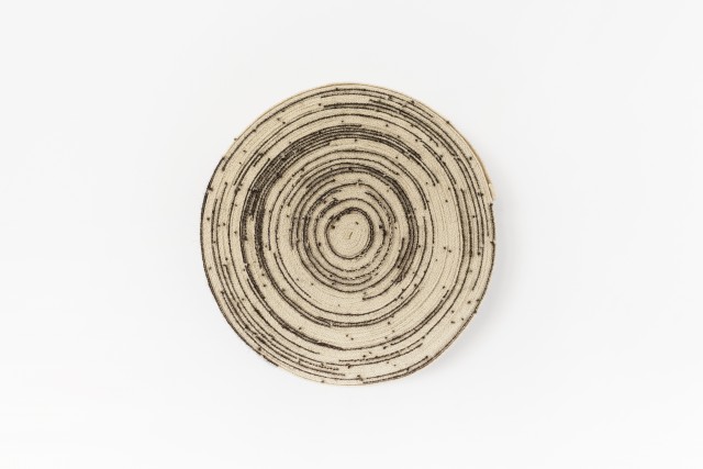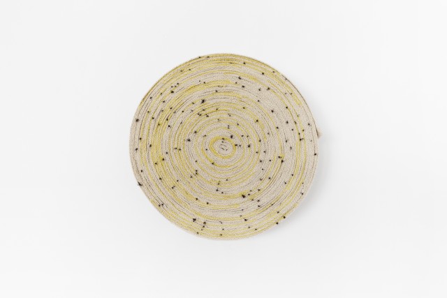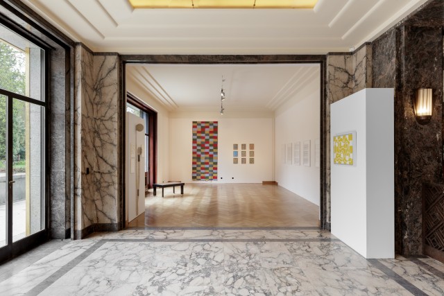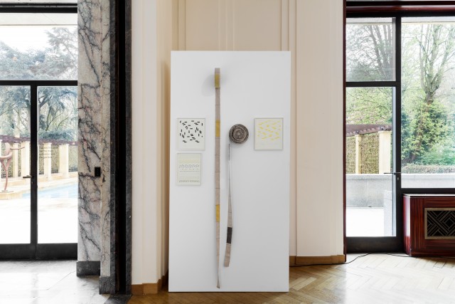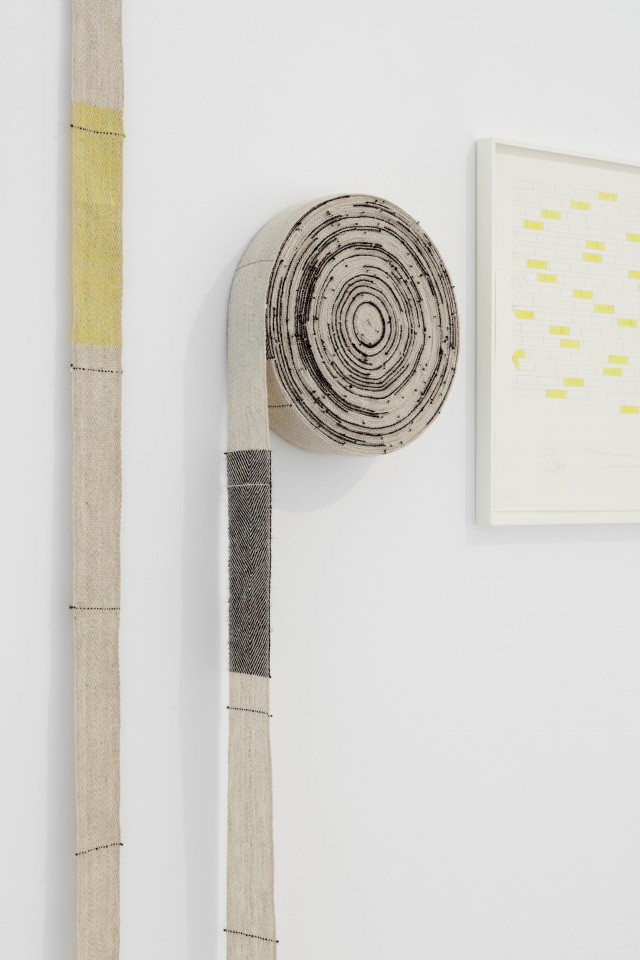 Leïla Pile describes her artistic process as rooted in every site she invests, adopting its dimensions and the flows of the built environment. Hence, each new setting provides the terrain for a unique experiment leading to the emergence of the final expression of the artist's gesture. The artist then follows a precise and rigorous protocol involving walking, measuring, drawing, dyeing, weaving, unrolling and winding, thereby understanding the space and magnifying the material. Her body provides the basis for measuring her environment: steps, fathoms, half-toises, cubits, hands, hand spans, and palms are all incorporated into drawings and visual scores made from woven strips and dyed threads. In these compositions, each unit follows the other, crossing or desynchronising itself in the spirit of conceptual music. For this exhibition, Leïla Pile has hand-woven the spatial dimensions of the Villa Empain on a traditional loom, in the form of two coiled ribbons: these 31 and 36 half-fathom – the distance between the sternum and the fingertips – convey a new perception of space on the scale of her own human body. The two rolls (respectively equal to the width and lenght of the Villa) condense and record the place in two objects that can be transposed. These pieces evoke the weavings of Anni Albers, for whom the dimensions of the body, movement, and systematisation also constituted important themes.